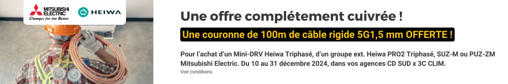 Pour bien terminer l'année, CD SUD x 3C CLIM vous propose une offre exclusive réservée à nos agences : du 10 au 31 décembre 2024, pour tout achat d’une machine parmi notre sélection Heiwa et Mitsubishi Electric, repartez avec une couronne de 100m de câble rigide 5G1,5 mm offerte (réf. 050301-D00016).