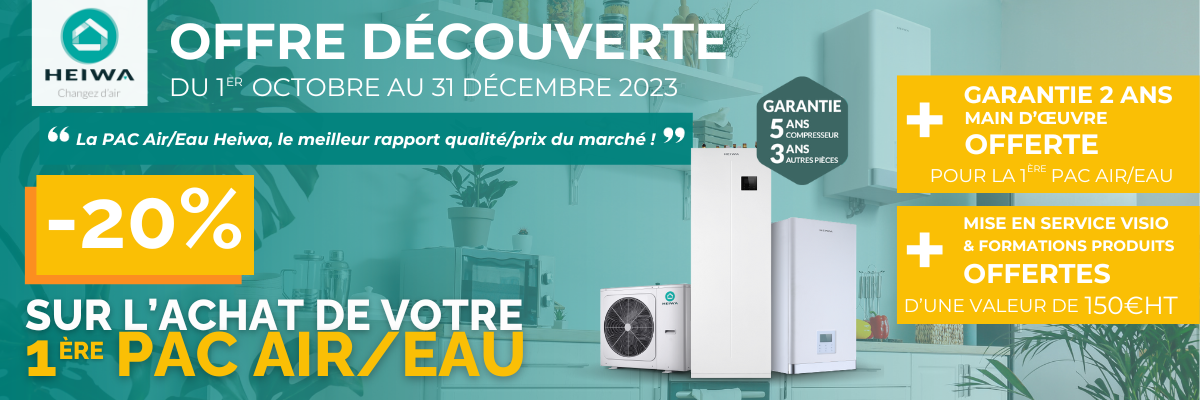 Dans le monde en constante évolution du génie climatique, il est essentiel pour les professionnels de rester à la pointe de la technologie pour répondre aux besoins de vos clients tout en améliorant leur rentabilité. C'est pourquoi Heiwa, notre partenaire de confiance en matière de distribution de pompes à chaleur, vous propose une offre inédite. Nous sommes ravis d'annoncer une réduction exclusive de 20% sur l'achat de votre première pompe à chaleur air/eau Heiwa, une offre valable tant pour nos nouveaux clients Heiwa que pour les nouveaux clients PAC Heiwa.