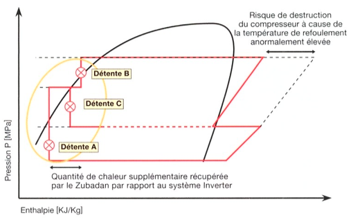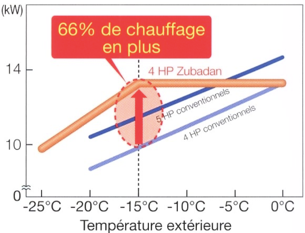 Véritable défi technologique, la technologie Zubadan permet d'assurer une puissance calorifique constante de +7°C à -15°C. Autrement dit, d'accepter une température de condensation élevée en évitant une surchauffe excessive au refoulement tout en maintenant une puissance calorifique par un débit massique important.
