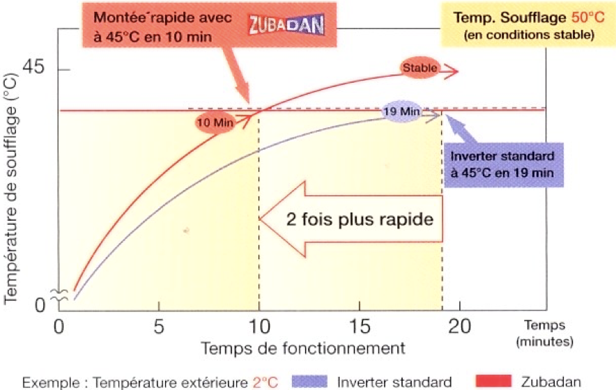 La technologie Zubadan permet, grâce à l'injection flash, une montée en température de la batterie deux fois plus rapide. Ainsi, les utilisateurs pourront bénéficier de la température qu'ils auront réglée beaucoup plus rapidement avec des appareils Zubadan qu'avec des appareils Inverter standard. Température de consigne rapidement atteinte.