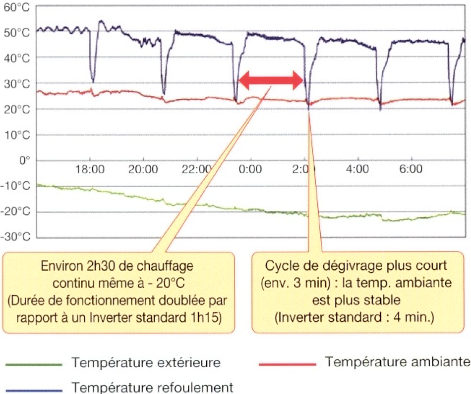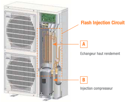 L'injection d'un mélange liquide/gaz au niveau du compresseur (variable de 100° gaz à 100% liquide) permet d'obtenir une température de refoulement maîtrisée et un débit massique suffisant pour que le système soit capable de délivrer une puissance de chauffage constante de +7°C à -15°C à l'extérieur.