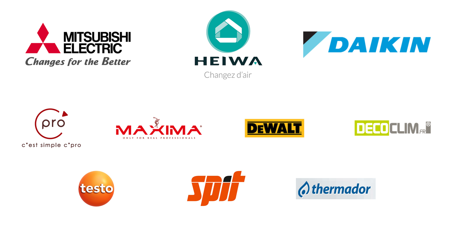Fiers de nos 25 ans d'expérience, nous avons créé des partenariats de confiance avec de nombreuses marques de pompes à chaleur Air/Air et Air/Eau comme Mitsubishi Electric, Heiwa ou Daikin ainsi que des marques de ventilation comme C'Pro, d'accessoires et d'outillage comme Artiplastic, Decoclim, Maxima ou Testo